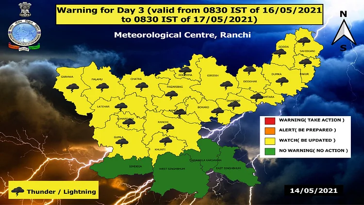 इधर, मौसम विभाग ने संभावना जतायी है कि 16 मई को राज्य के चार जिले पूर्वी और पश्चिमी सिंहभूम, सरायकेला- खरसावां और सिमडेगा जिला को छोड़ अन्य 20 जिलों में वज्रपात की संभावना है. इसके लिए मौसम विभाग ने यलो एलर्ट जारी कर दिया है.
