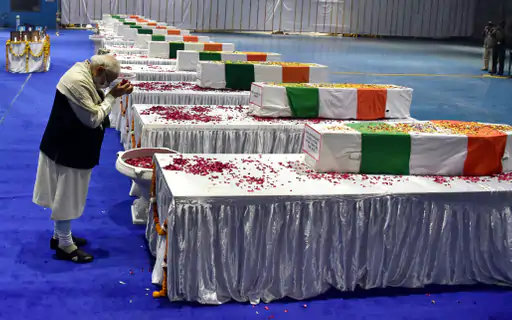 प्रधानमंत्री नरेंद्र मोदी ने भारत के पहले चीफ ऑफ डिफेंस स्टाफ (CDS) जनरल बिपिन रावत (बीरा), उनकी पत्नी और 11 अन्य सैन्य अधिकारियों को नयी दिल्ली में श्रद्धांजलि दी. गुरुवार की रात को नयी दिल्ली के पालम एयरबेस पहुंचे और वहां तमिलनाडु में हुए हेलिकॉप्टर हादसे में जान गंवाने वाले सेना के वीर सपूतों को श्रद्धासुमन अर्पित किये. इसके बाद मोदी शहीदों के परिजनों से एक-एक कर मिले और उन्हें ढांढस बंधाया।
